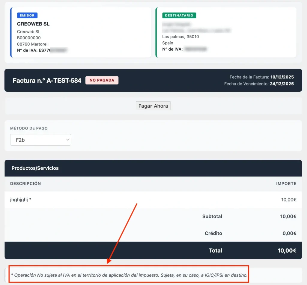 Activa esta opción solo si tu empresa está registrada en el sistema VIES y dispones de un NIF intracomunitario válido (como ESB12345678).