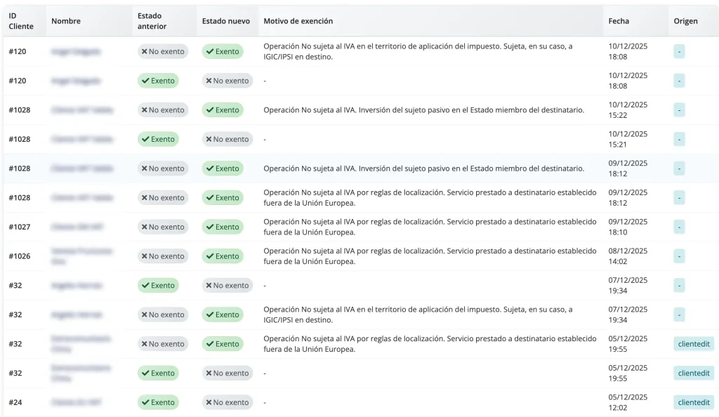 Cada vez que un cliente cambia de estado de exención (ya sea por los hooks ClientAdd, ClientEdit o por el cronjob), se registra: