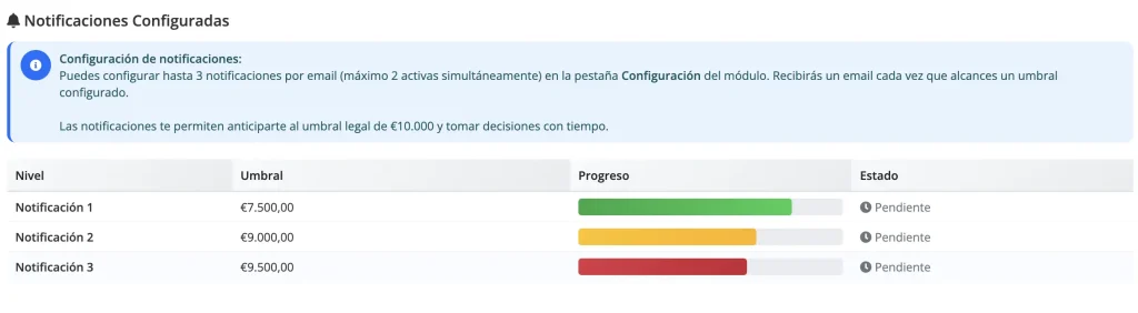 Configura hasta 3 notificaciones por email para anticiparte al umbral legal: