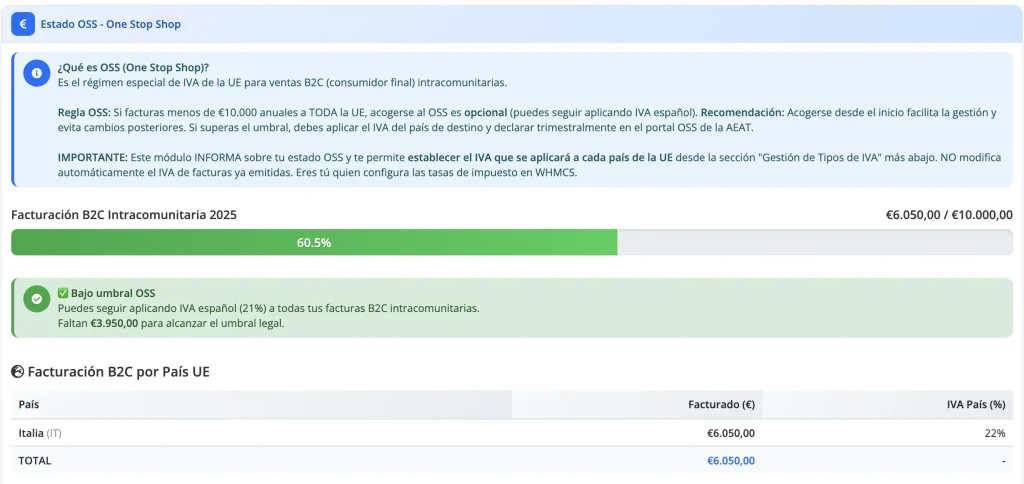 - Soporte OSS: Monitorización del umbral One Stop Shop (10.000€)
