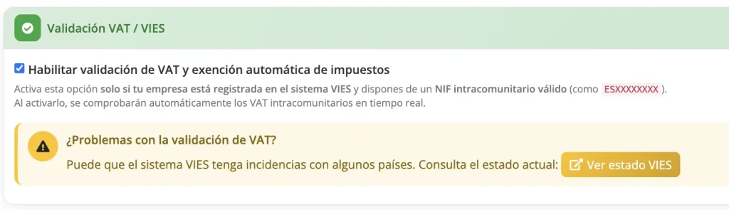 Si tienes problemas con la validación de VAT, el servicio VIES puede tener incidencias temporales. Puedes consultar el estado actual con el botón Ver estado VIES.