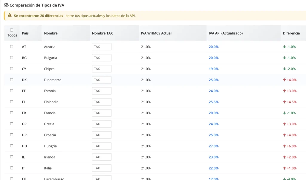 - Configura los tipos de IVA de cada país en WHMCS usando la herramienta de “Consultar tipos actualizados”